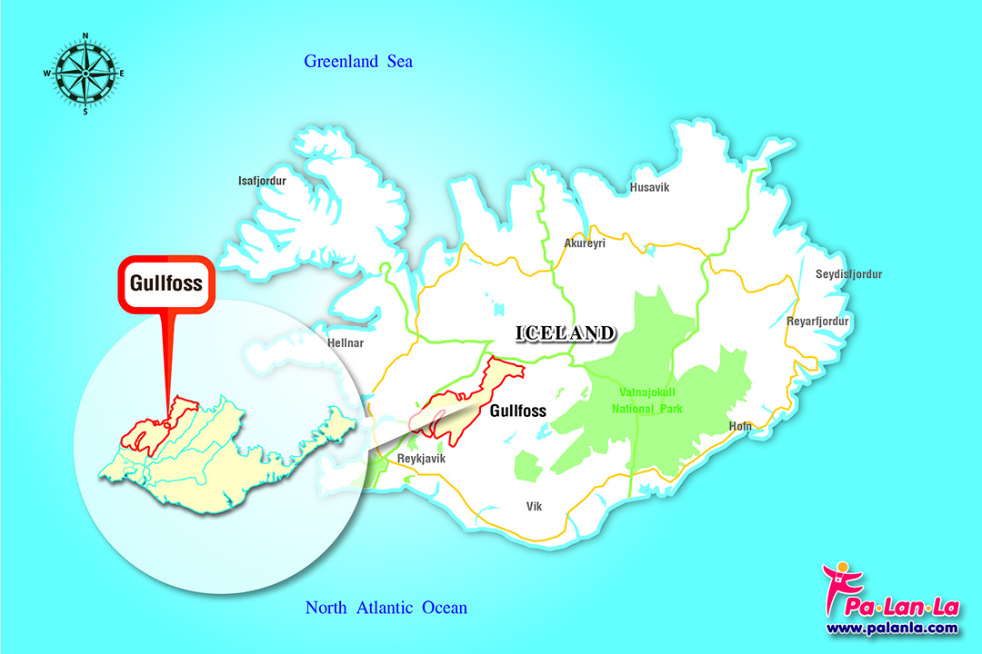 จากเมืองเรคยาวิกไปยังน้ำตกกุลลฟอสส์ ใช้เส้นทาง Vesturlandsvegur/ถนนหมายเลข 49 ระยะเวลา 3 นาที (1.3 กม.) จากนั้นตาม Þjóðvegur 1, Biskupstungnabraut และ ถนนหมายเลข 35 ไปทาง Gullfoss Parking มุ่งไป Suðurland ระยะเวลา 1 ชม. 31 นาที (116 กม.) จากนั้นขับไปทาง Gullfoss Parking