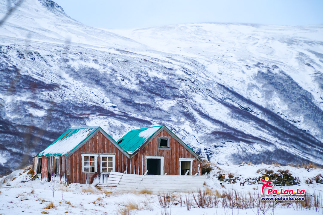 วิวข้างทาง บ้านไม้หลังเล็กๆ กับฉากหลังที่เป็นภูเขา