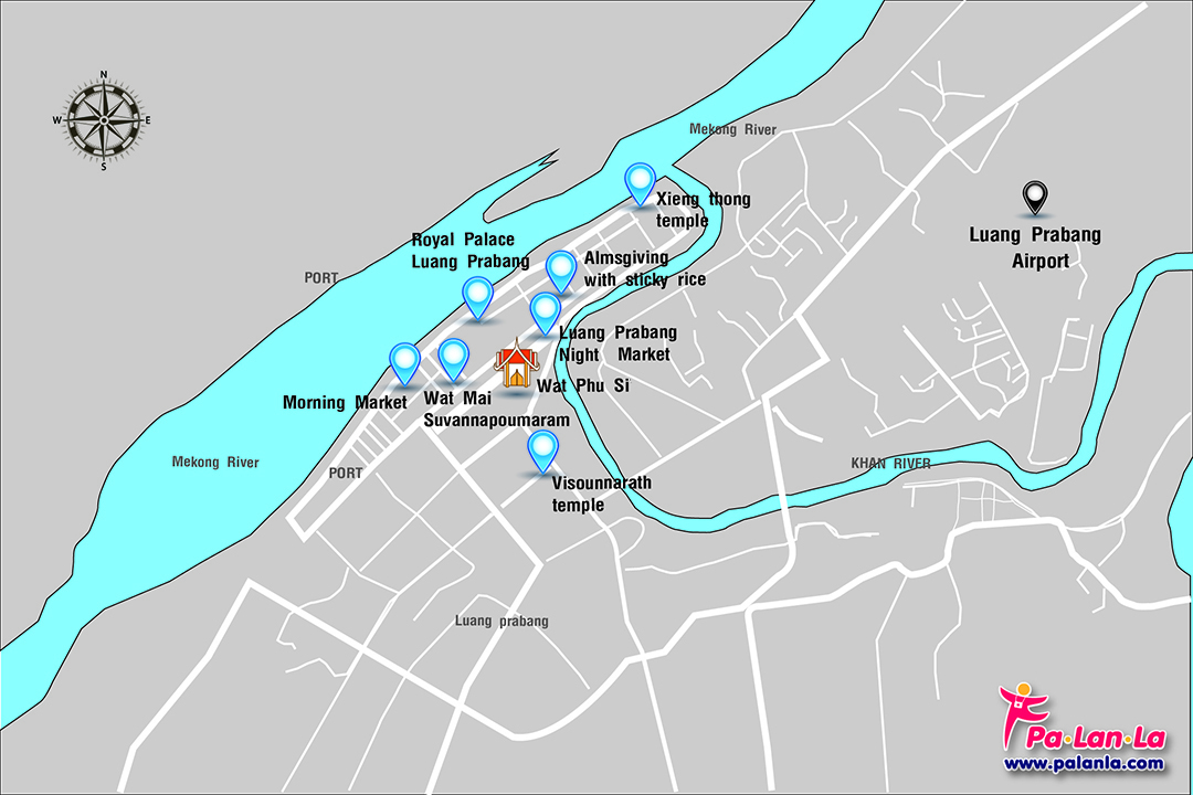แผนที่แสดงการเดินทางจากสนามบินนานาชาติหลวงไปพระบางไปยังตัวเมืองหลวงพระบาง