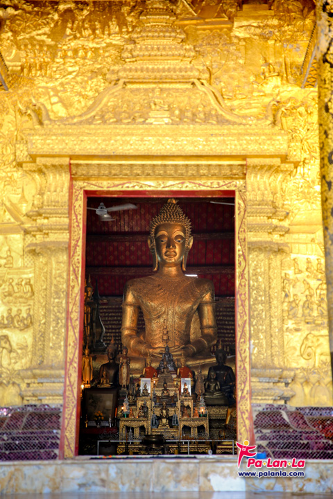 ขณะเดียวกันก็มีรูปมังกรแบบจีนสลักไว้ด้านล่าง ส่วนภายในประดิษฐานพระพุทธรูปประธาน เป็นพระพุทธรูปทรงเครื่อง คนลาวเรียกว่า “พระเอ้” และพระพุทธรูปทรงเครื่องต้นอย่างพระมหาจักรพรรดิ ศิลปะรัตนโกสินทร์ ส่วนผนังด้านในประดับพระพิมพ์ปิดทององค์เล็กๆ เป็นหมื่นองค์ รวมถึงภาพปูนปั้นปิดทองเรื่องพระเวสสันดรที่แฝงด้วยเรื่องราวการดำเนินชีวิตของชาวเมืองหลวงพระบาง