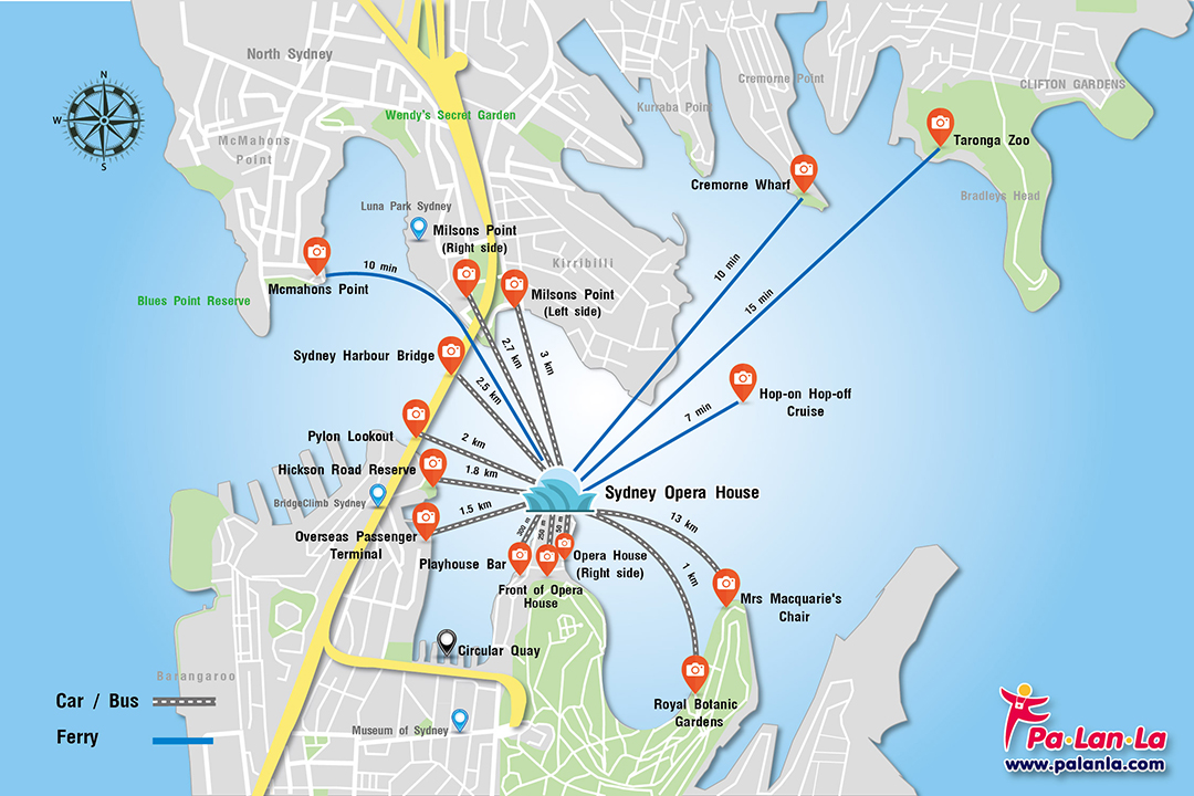 ซิดนีย์ โอเปร่าเฮ้าส์ ถือเป็นทั้งสถานที่ท่องเที่ยวยอดนิยมและแลนด์มาร์คอันดับ 1 ของประเทศออสเตรเลีย ด้วยลักษณะของอาคารอันสวยงามแปลกตาที่ถูกสร้างขึ้นในรูปแบบสถาปัตยกรรมสมัยใหม่ และที่ตั้งบริเวณริมอ่าวซิดนีย์ ที่สามารถมองเห็นได้อย่างชัดเจนจากมุมต่างๆโดยรอบ ซึ่งแต่ละมุมก็มีความสวยงามที่แตกต่างกันออกไป จนหลายคนอาจไม่แน่ใจว่ามุมทั้งหมดในพื้นที่รอบอ่าวซิดนีย์นั้นมีความพิเศษหรือแตกต่างกันเช่นไร หรือควรถ่ายภาพจากมุมใดถึงจะดีที่สุด
