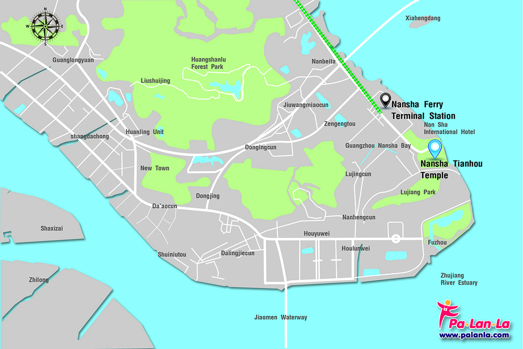 - รถไฟใต้ดิน จากตัวเมืองกวางโจว ขึ้นรถไฟใต้ดินสาย 4 (สีเขียว) ไปลงที่สถานี Nansha Ferry Terminal ค่ารถไฟใต้ดินในเมืองกวางโจวมีราคาเริ่มต้นที่ 2 หยวน และเพิ่มขึ้น 1 หยวนทุกๆ 6 กิโลเมตร