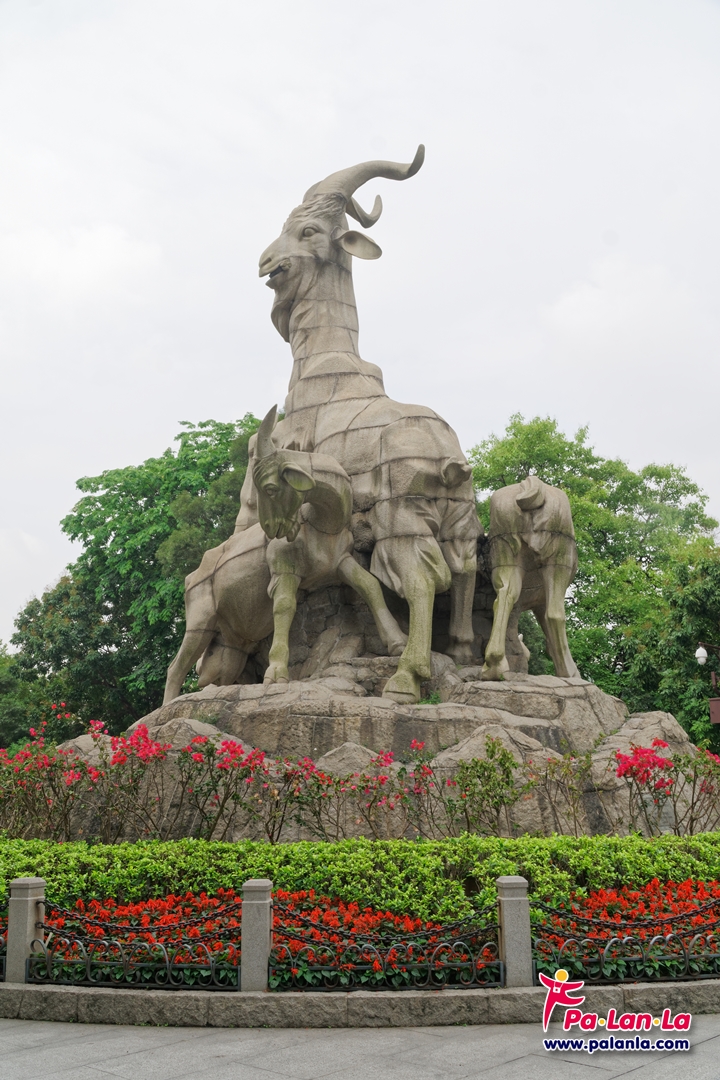 อนุสาวรีย์แพะ 5 ตัว เป็นอนุสาวรีย์ที่สร้างขึ้นด้วยหินแกรนิต 120 ก้อน แกะสลักและประกอบกันเป็นรูปแพะ 5 ตัว ซึ่งเป็นสัญลักษณ์ประจำเมืองกวางโจว จากเรื่องเล่าที่ว่าในอดีตนั้น เมืองกวางโจวมีความอดอยากแร้นแค้นเป็นอย่างมาก จนกระทั่งในวันหนึ่งได้มีเทวดา 5 องค์ขี่แพะ 5 ตัวที่คาบรวงข้าว 6 รวงลงมาจากสวรรค์ และเทวดาได้มอบรวงข้าวนั้นให้กับชาวเมืองกวางโจว พร้อมอวยพรให้เมืองนี้พ้นจากความอดอยาก เต็มไปด้วยความอุดมสมบูรณ์ตลอดเวลา ซึ่งหลังจากนั้นเมืองกวางโจวก็ได้มีความเจริญรุ่งเรืองเป็นอย่างมากมาจนถึงในปัจจุบัน ทำให้ชาวเมืองกวางโจวซาบซึ้งในบุญคุณ และได้ตั้งอนุสาวรีย์แพะห้าตัวขึ้นมาเพื่อเป็นการรำลึกถึงเรื่องราวนี้