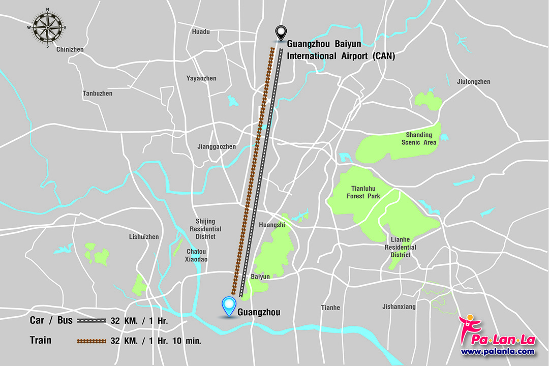 - รถไฟใต้ดิน จากสถานีรถไฟใต้ดิน Airport South ที่สนามบินกวางโจว มีรถไฟใต้ดินสาย 3 (สีส้ม) วิ่งเข้าสู่ตัวเมืองอย่างสะดวกสบาย ใช้เวลาเดินทางประมาณ 1 ชั่วโมง ค่าโดยสารจากสนามบินมายังตัวเมืองราคาประมาณ 7 หยวน