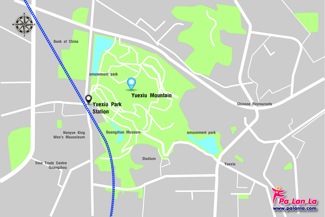 - รถไฟใต้ดิน จากตัวเมืองกวางโจว ขึ้นรถไฟใต้ดินสาย 2 (สีน้ำเงิน) ไปลงที่สถานี Yuexiu Park ออกทางออก B1 ค่ารถไฟใต้ดินในเมืองกวางโจวมีราคาเริ่มต้นที่ 2 หยวน และเพิ่มขึ้น 1 หยวนทุกๆ 6 กิโลเมตร