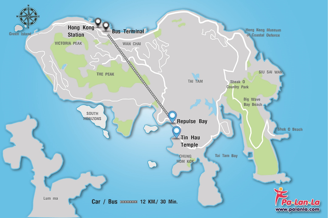 - รถบัส ขึ้นรถบัสสาย 6, 6A, 6X, 66 หรือ 260 จาก Bus Terminal ที่ตึก Exchange Square (ใกล้กับสถานี MTR Central และ Hong Kong) ค่าโดยสารเที่ยวละ HK$4.60