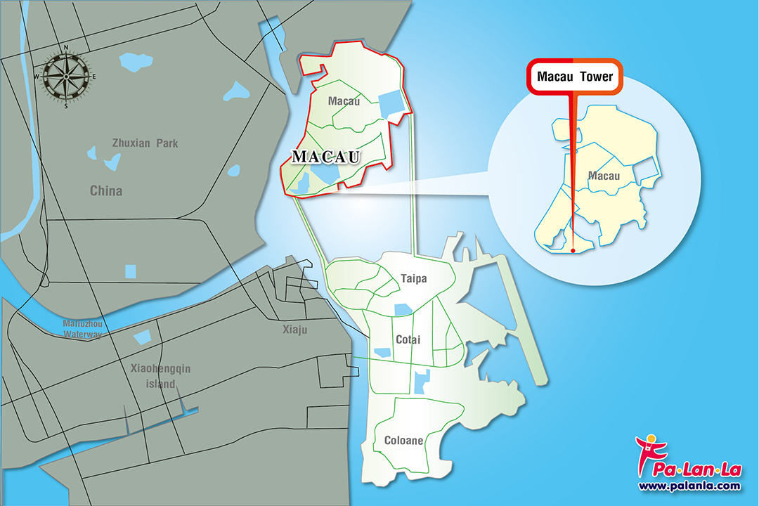 มาเก๊าตั้งอยู่ทางชายฝั่งทางใต้ของประเทศจีน แบ่งเป็น 8 เขตการปกครอง แต่มีเพียง 4 เขตใหญ่ๆที่นักท่องเที่ยวรู้จักคือ เขตมาเก๊าเพนนิซูล่า (Macau Penisula) หรือที่รู้จักกันในชื่อฝั่งมาเก๊า, เขตไทปา, เขตโคไท, เขตโคโลอาน ซึ่งมาเก๊าทาวเวอร์นั้น ตั้งอยู่ในเขตมาเก๊าเพนนิซูล่า