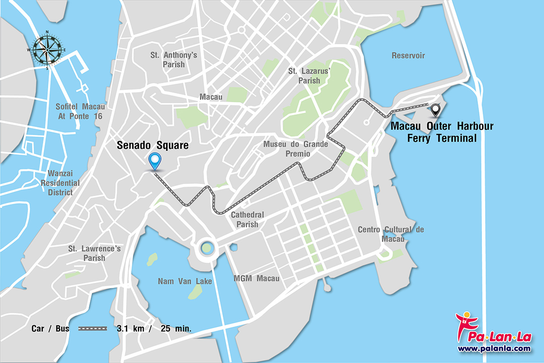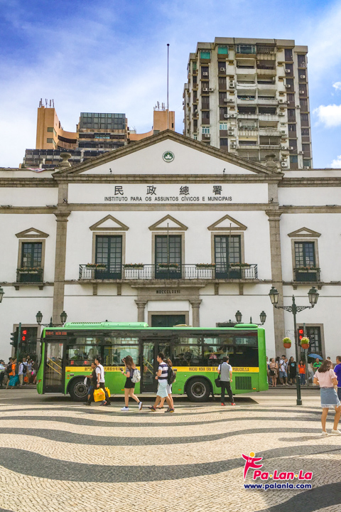 - รถบัส สาย 3, 3A, 4, 8A, 10, 10A, 11, 18, 19, 21A, 26A, 33 ราคาประมาณ 2.5-3 เหรียญมาเก๊า (MOP) ถ้าวิ่งข้ามเกาะจะประมาณ 4-5 เหรียญ (MOP) ถ้าวิ่งจากสนามบินเข้าเมืองจะประมาณ 6 เหรียญ (MOP) สามารถลงแถวจัตุรัสเซนาโด้ที่เป็นแหล่งท่องเที่ยวยอดนิยมได้โดยไม่ต้องต่อรถ
