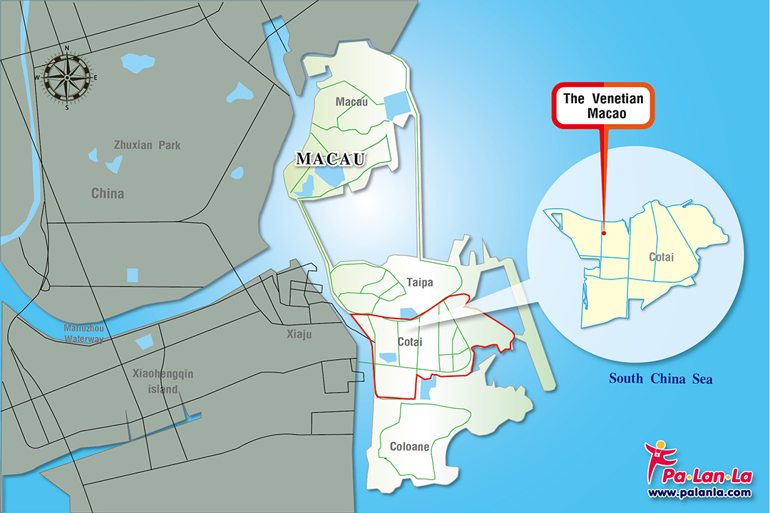 มาเก๊าตั้งอยู่ทางชายฝั่งทางใต้ของประเทศจีน แบ่งเป็น 8 เขตการปกครอง แต่มีเพียง 4 เขตใหญ่ๆที่นักท่องเที่ยวรู้จักคือ เขตมาเก๊าเพนนิซูล่า (Macau Penisula) หรือที่รู้จักกันในชื่อฝั่งมาเก๊า, เขตไทปา, เขตโคไท, เขตโคโลอาน ซึ่งเดอะเวเนเชี่ยนนั้น ตั้งอยู่ในเขตโคไท