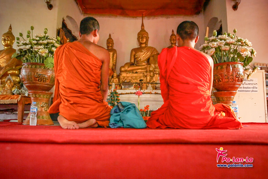พระภิกษุสงฆ์ท่องบทสวดมนต์ที่หน้าพระพุทธรูปบริเวณพระธาตุพูสี