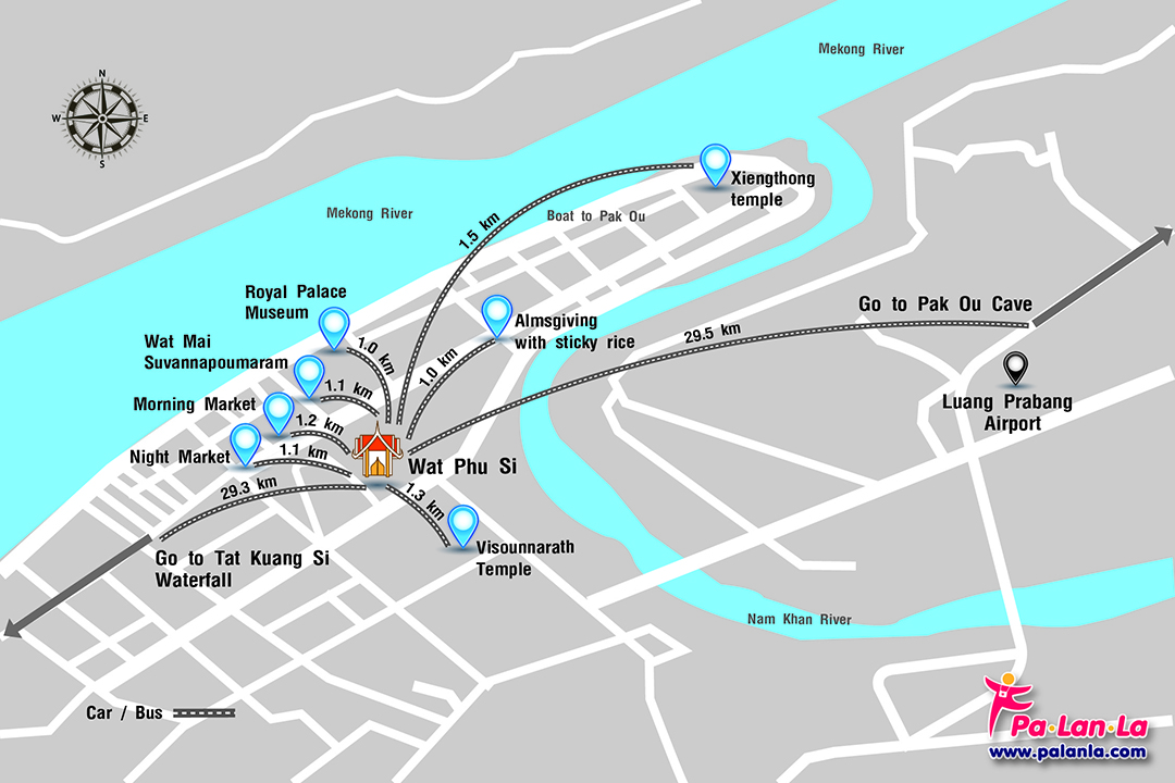 แผนที่แสดงระยะทางจากวัดพูสี (ใจกลางเมือง) ไปยังสถานที่ท่องเที่ยวต่างๆ