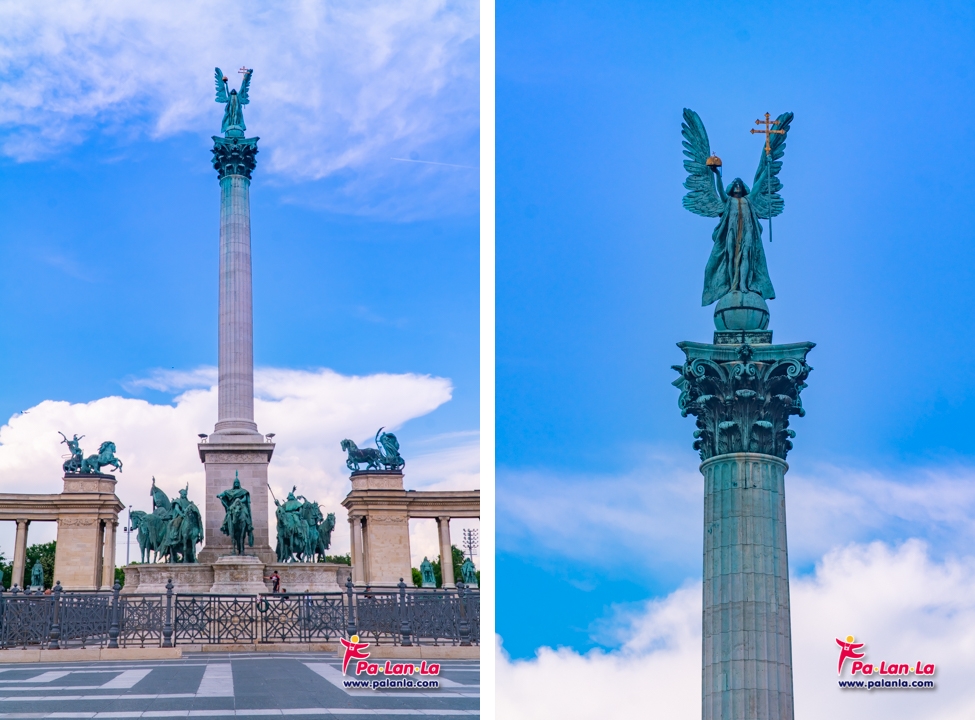 จัตุรัสวีรบุรุษ ถูกสร้างขึ้นในปี 1896 และเสร็จสมบูรณ์ในปี 1900 เพื่อเป็นการเฉลิมฉลองครบรอบ 1,000 ปีของฮังการี โดยเป็นผลงานการออกแบบของ Albert Schikedanz ซึ่งไม่เพียงออกแบบจัตุรัสแห่งนี้เท่านั้น แต่ยังสรรสร้างรูปแบบของอาคารที่โด่งดังใกล้ๆกันอย่างพิพิธภัณฑ์ศิลปะอีกด้วย ขณะที่รูปปั้นอัครเทวดาด้านบนเป็นผลงานของ György Zala ประติมากรคนสำคัญ ซึ่งงานของเขาที่จัตุรัสวีรบุรุษนี้ถือเป็นหนึ่งในผลงานชิ้นเอกชิ้นหนึ่งของเขา (อ่านรายละเอียดเพิ่มเติมได้ที่ https://www.budapestinfo.hu/heroes-square)