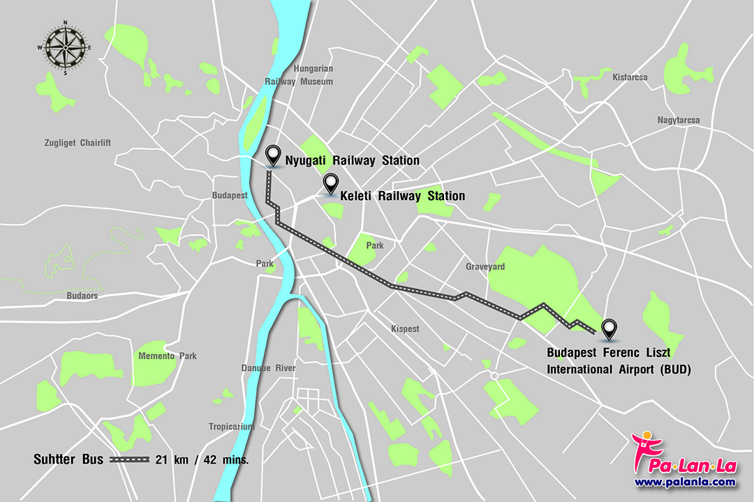 - ชัตเตอร์บัสจากสนามบิน ซึ่งมีให้บริการทุก 20 นาที ตั้งแต่เวลา 3.40 น. – 1.20 น.ของอีกวัน โดยใช้เวลาในการเดินทางจากสนามบินถึงตัวเมืองบูดาเปสต์ประมาณ 42 นาที ทั้งนี้ นักท่องเที่ยวสามารถอ่านรายละเอียดเพิ่มเติมเกี่ยวกันเส้นทาง และอัตราค่าบริการได้ที่ https://bkk.hu/en/airport-shuttle/