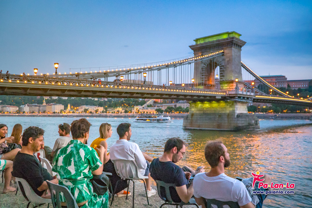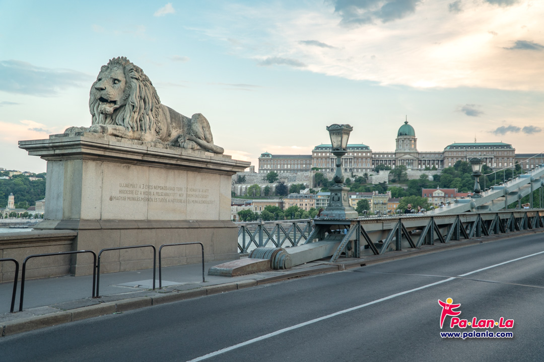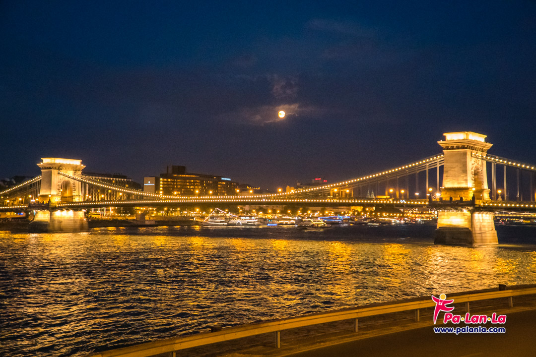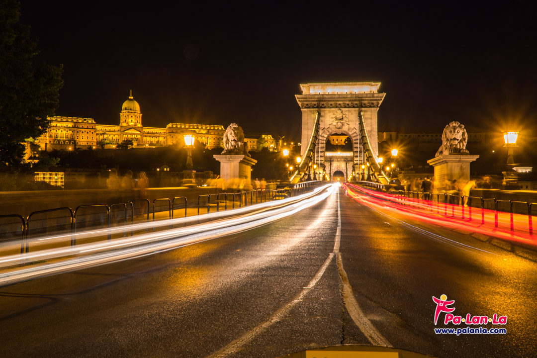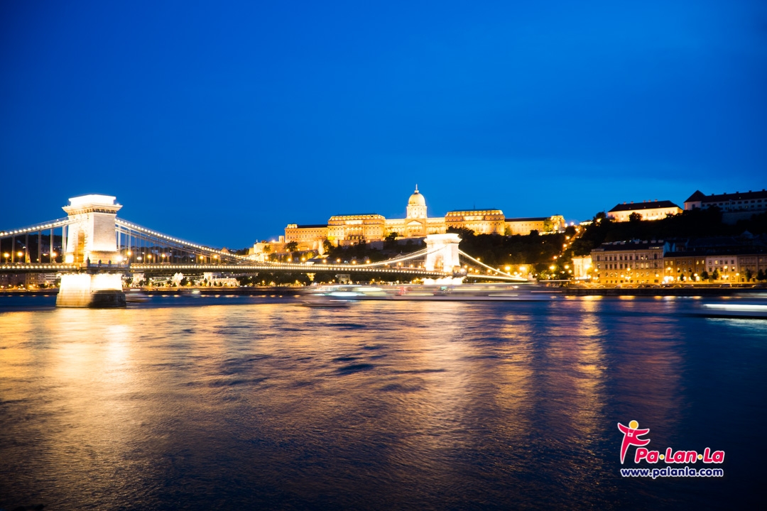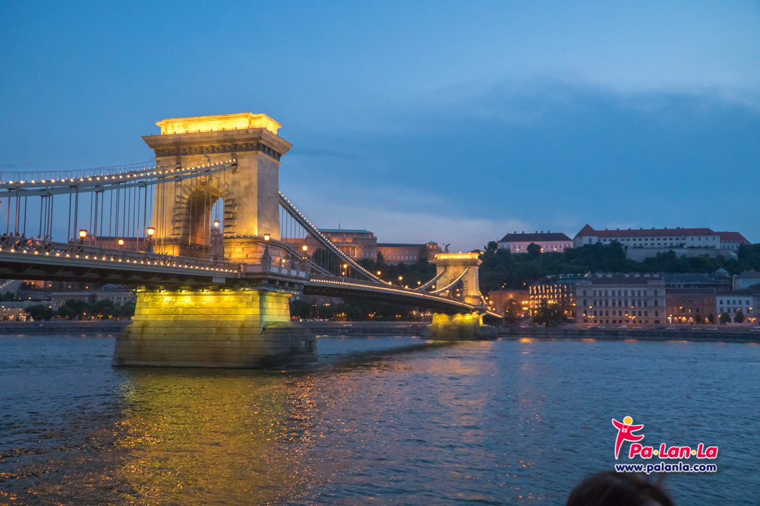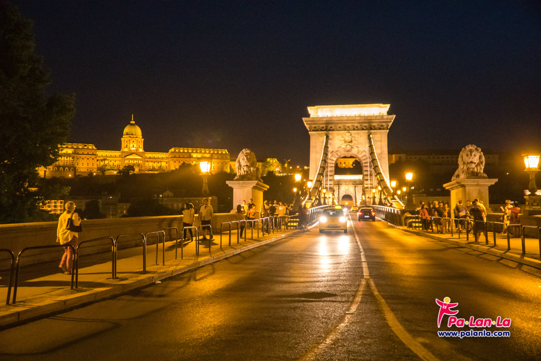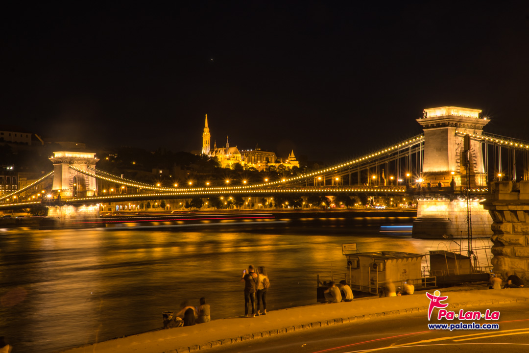 บนสะพานโซ่ที่เปิดไฟสว่างไสวแล้วกับปราสาทบูดาที่อยู่ด้านหลังอีกฟากฝั่ง