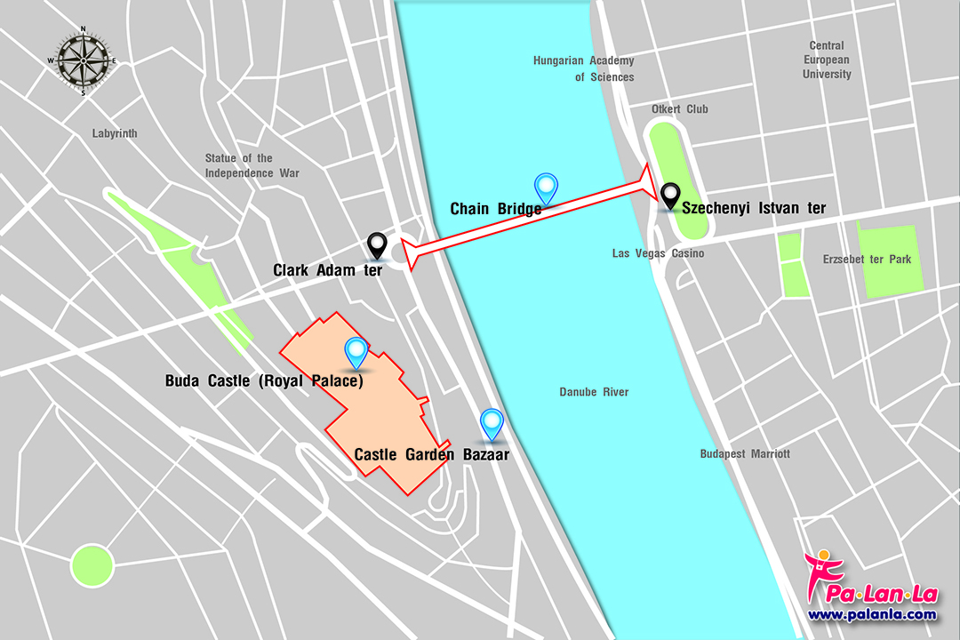 - รถโดยสารสาธารณะ นักท่องเที่ยวสามารถเดินทางไปยังได้ด้วยรถโดยสารสาธารณะ สาย 16 และ 105 เลือกลงที่ป้าย Széchenyi István tér ซึ่งอยู่ใกล้กับเชิงสะพานฝั่งเปสต์ (Pest) หรือเลือกลงที่ ป้าย Clark Ádám tér ฝั่งบูดา ก็ได้เช่นกัน โดยสามารถตรวจสอบรายละเอียดเกี่ยวกับเส้นทางโดยสารเพิ่มเติมได้ที่ https://bkk.hu/en/timetables/