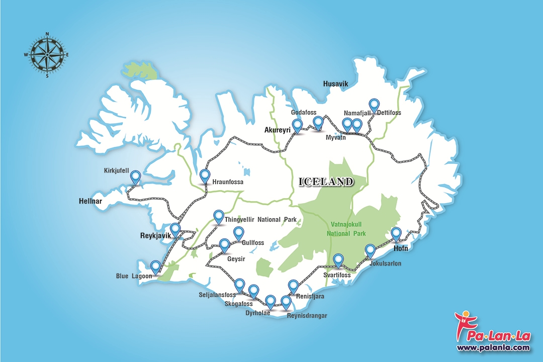 ข้อมูลการเดินทาง : การเดินทางจากสนามบินนานาชาติ Keflavik International Airport (KEF) ไปยังตัวเมืองเรคยาวิกใช้เวลา 40 – 45 นาที นักท่องเที่ยวสามารถใช้บริการ เช่ารถยนต์ ได้จากหลากหลายบริษัท ศึกษาข้อมูลและจองได้ล่วงหน้าได้ก่อนเดินทางได้ที่ www.motorhomerepublic.com และ www.rentalcars.com ทั้งนี้ หากนักท่องเที่ยวไม่ได้เช่ารถยนต์ขับจากสนามบินเลยก็สามารถใช้บริการ รถโดยสารสาธารณะ ชื่อ Flybus Airport Transfers เพื่อไปลงที่ BSI Bus Terminal หรือจุดจอดต่างๆ ในตัวเมืองเรคยาวิก โดยรถจะมีให้บริการทุกๆ 30 นาทีหรือ 1 ชั่วโมง ราคาอยู่ที่ 2.950 ISK ต่อคน โดยนักท่องเที่ยวสามารถจองตั๋วล่วงหน้าได้ที่ https://www.re.is/flybus