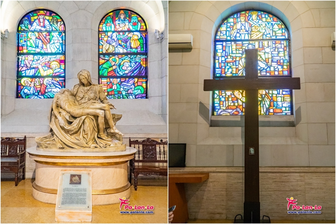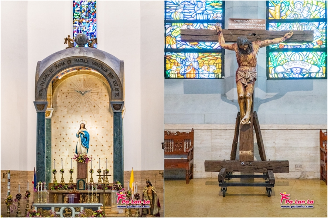 แท่นบูชาหลักที่มีรูปปั้นสัมฤทธิ์ชุบทองขนาดเท่าตัวจริงของแม่พระปฏิสนธินิรมล การออกแบบและสีสันของหน้าต่างกรุกระจกของตัวโบสถ์ มีมากกว่า 130 บาน รวมถึงหน้าต่างอีกแปดคู่ภายในโดมของวิหารนี้