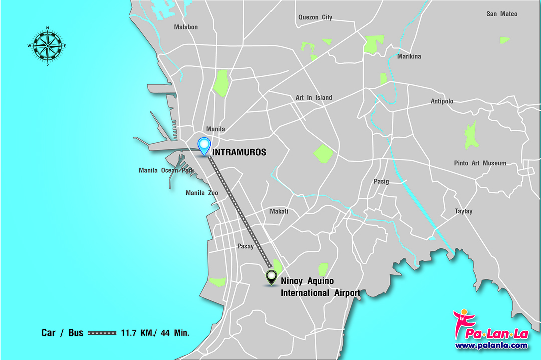 - ชัตเตอร์บัส จากสนามบิน จุดจอดรถบัสอยู่หน้าอาคาร เทอมินอล 3 เมื่อออกจากอาคารมา ทางด้านขวานักท่องเที่ยวสามารถเลือกใช้บริการจากสนามบินเพื่อเข้าสู่ตัวเมืองได้ โดยมีระยะทาง 11.7 กิโลเมตร ใช้เวลาในการเดินทางประมาณ 1 ชั่วโมง และต้องต่อรถแท็กซี่เพื่อไปยังย่านอินทรามูรอสเพื่อเที่ยวชมพิพิธภัณฑ์คาซามะนิลา