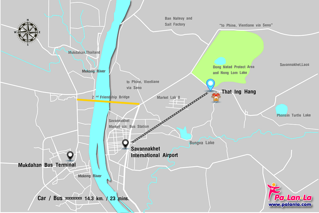 - รถส่วนตัว สำหรับนักท่องเที่ยวที่รักอิสระในการเดิน เมื่อข้ามสะพานมิตรภาพไทย-ลาว แห่งที่ 2 มาแล้ว ให้มุ่งหน้าไปตามถนนทางหลวงหมายเลข 13 โดยจะผ่านตลาดหลัก 8 ซึ่งเป็นจุดตรวจคนเข้าเมือง การขับไปทางนี้มีระยะทาง ประมาณ 14.8 กิโลเมตร และใช้เวลา 23 นาทีจนกระทั่งถึงพระธาตุอิงฮัง