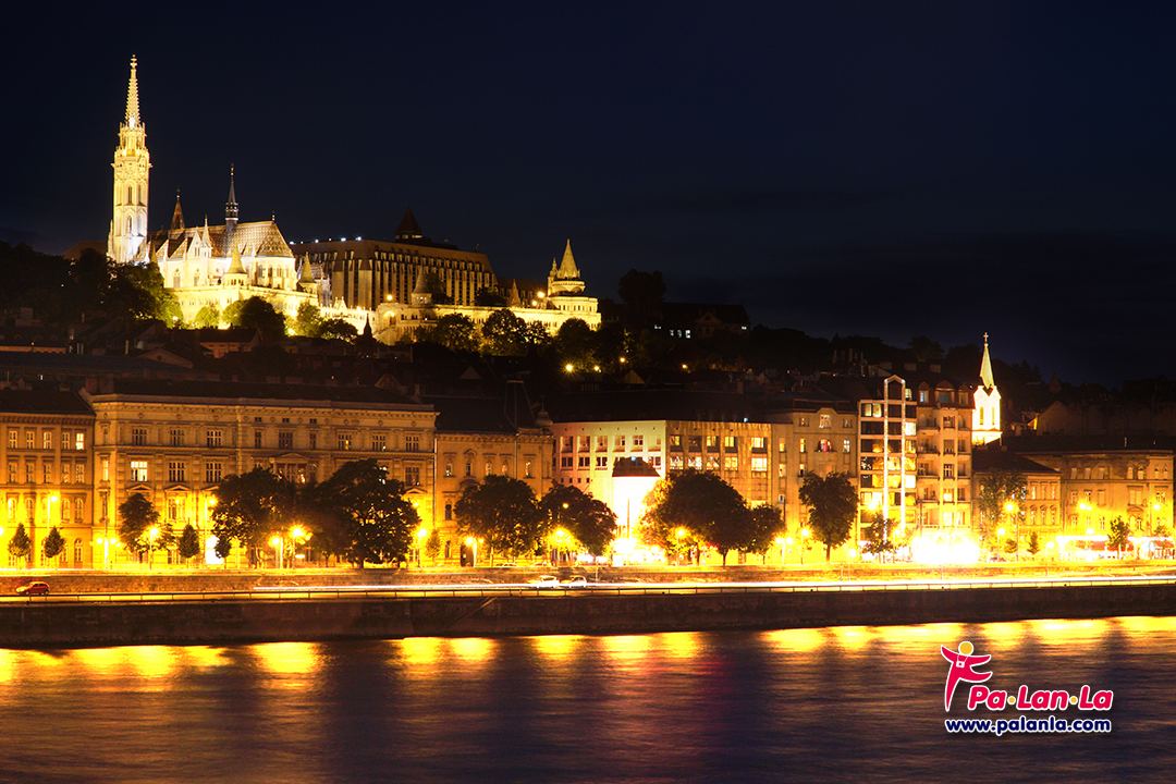 ค่ำคืนของป้อมปราการชาวประมงและโบสถ์แมทเทียสจากอีกฝั่งของแม่น้ำดานูบ