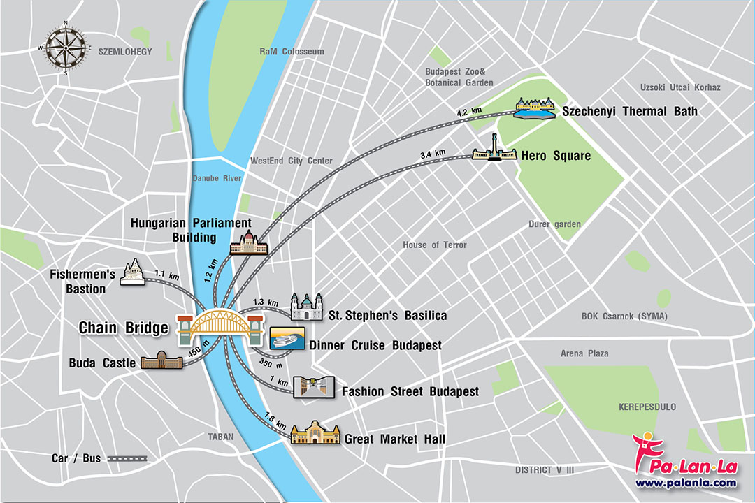 แผนที่แสดงสถานที่ท่องเที่ยวสำคัญในเมืองบูดาเปสต์โดยมีสะพานโซ่ที่โดดเด่นเป็นศูนย์กลาง