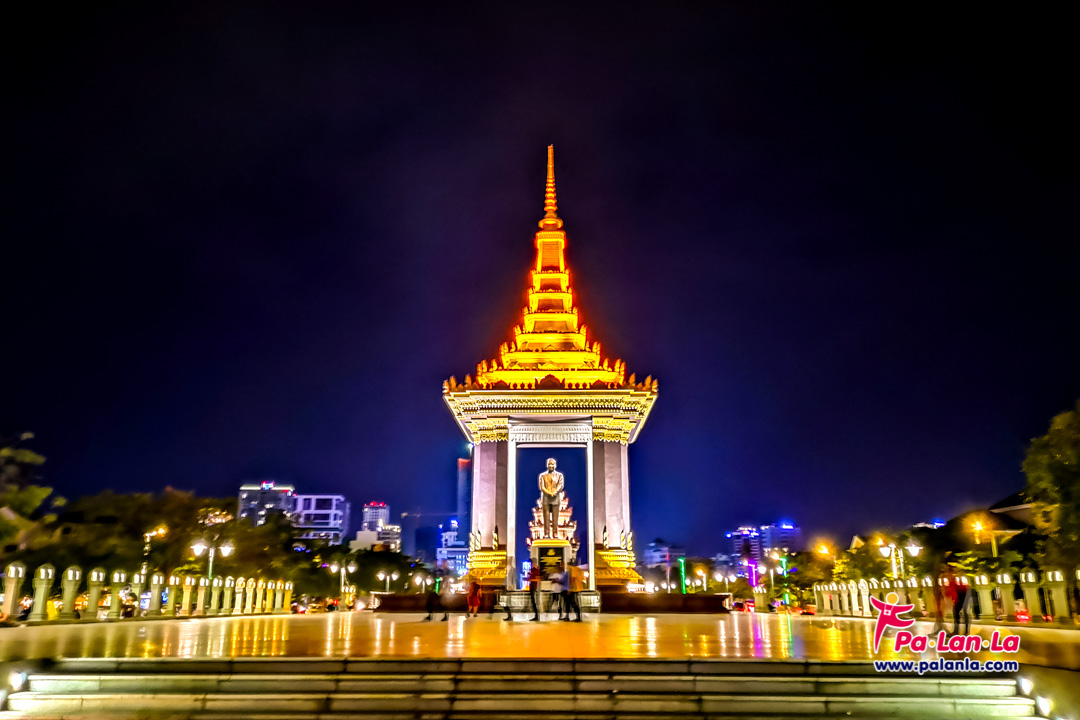 อนุสาวรีย์สมเด็จพระนโรดมสีหนุที่เปิดไฟสว่างไสวในยามค่ำคืน