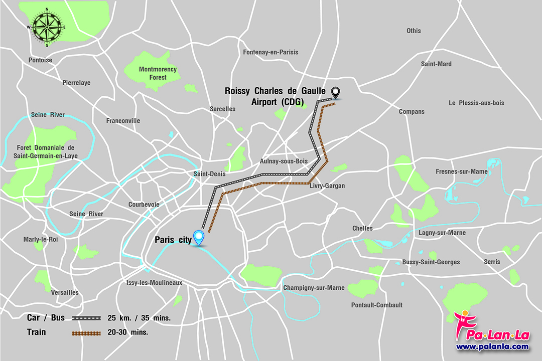 ปารีสเป็นเมืองหลวงของประเทศฝรั่งเศส มีสนามบินที่สำคัญคือ สนามบิน Roissy Charles de Gaulle ซึ่งอยู่ห่างจากเมืองปารีสไปทางตอนเหนือ 25 กิโลเมตร นักท่องเที่ยวจึงสามารถเดินทางมายังเมืองปารีสได้ด้วยการเดินทางหลากหลายประเภท อาทิ