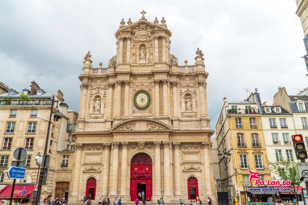 ด้านหน้าของโบสถ์เซนต์ปอลเซนต์หลุยส์ที่ตระหง่านรอคอยนักท่องเที่ยวในปารีส