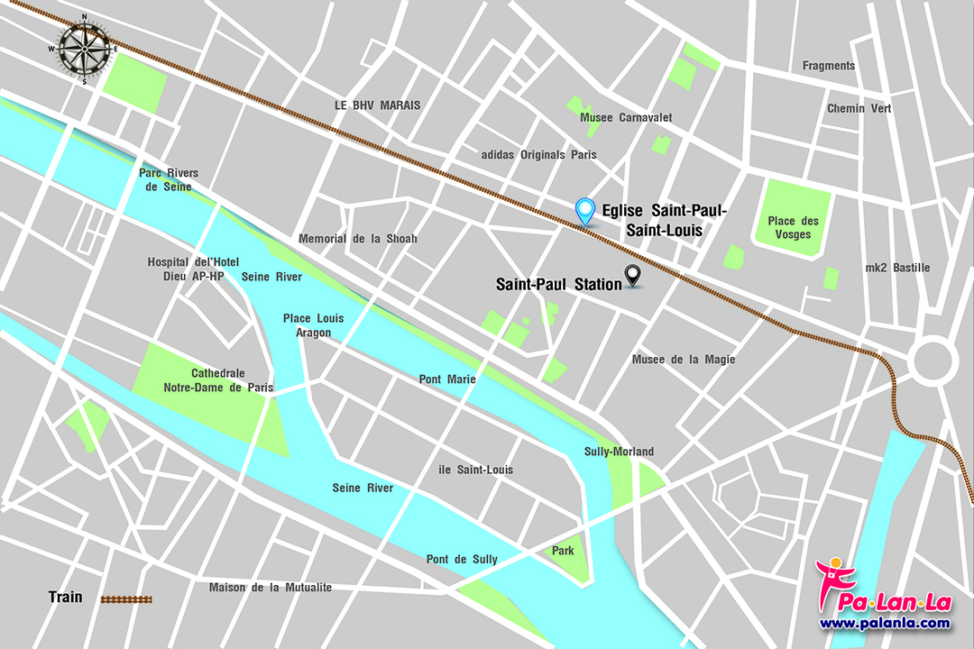 - รถไฟ Metro หรือรถไฟฟ้าใต้ดิน เป็นหนึ่งในบริการสาธารณะที่เชื่อมต่อกับทุกที่ในปารีสและได้รับความนิยมจากนักท่องเที่ยวอย่างสูง โดยนักท่องเที่ยวสามารถเลือกใช้บริการ รถไฟฟ้าใต้ดินสาย 1 ลงที่สถานี Saint-Paul Station ทั้งนี้ นักท่องเที่ยวสามารถตรวจสอบรายละเอียดเส้นทาง และตารางเวลาในการเดินรถเพิ่มเติมได้ที่ https://www.ratp.fr/en/