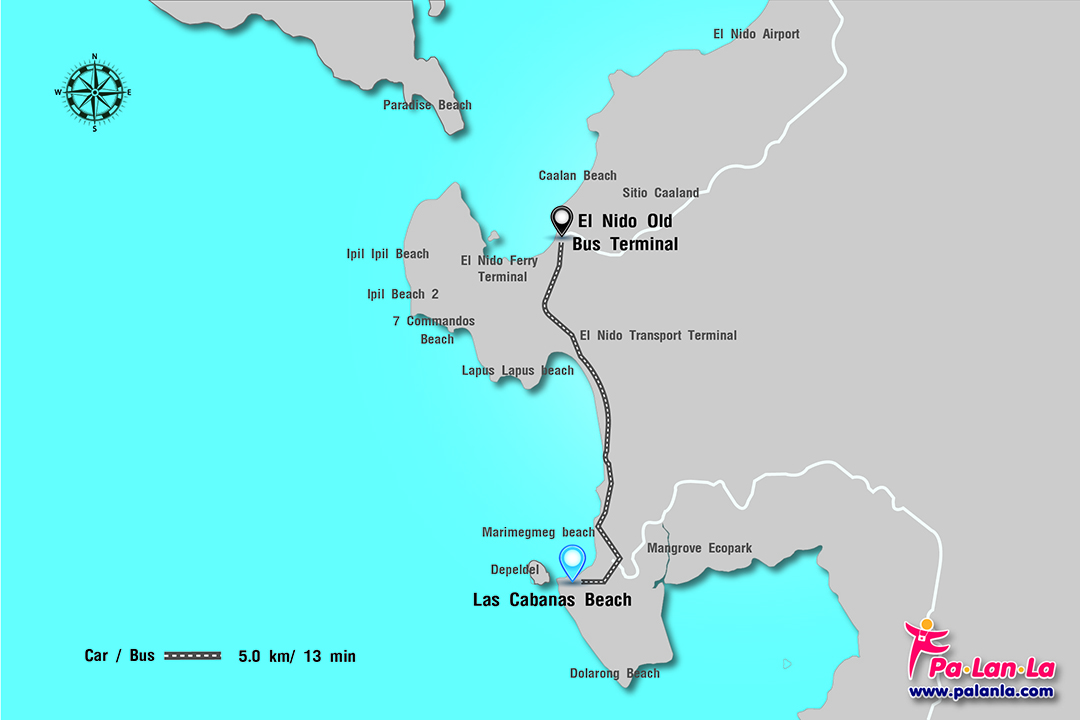 - รถสามล้อ (Tricycle) สามารถขึ้นรถสามล้อได้ทุกที่เมื่อมาถึงเมืองเอลนิโด้แล้ว เนื่องจากว่าตัวเมืองเอลนิโด้มีขนาดเล็กและรถสามล้อเป็นรถสาธารณะที่ใช้กันในท้องถิ่นและหาได้ทั่วไป แต่ถ้าหากนั่งรถบัสมาจากเมืองปวยร์โต ปรินเซซามาลงที่สถานีขนส่งรถบัสของเมืองเอลนิโด้ จะนั่งไปยัง Las Cabanas Beach เป็นเวลา 13 นาที ระยะทางโดยประมาณ 5 กิโลเมตร