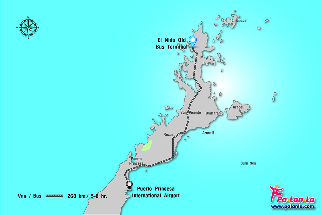 - รถบัส (RoRo Bus) นักท่องเที่ยวต้องนั่งรถสามล้อหรือแท็กซี่จากสนามบินเพื่อไปขึ้นรถโรโรบัส ที่ San Jose terminal ซึ่งเป็นที่นิยมในคนท้องถิ่นเมื่อต้องเดินทางไปยังเมืองเอลนิโด้เนื่องจากที่นั่งกว้างกว่ารถตู้ทำให้นั่งได้สบายกว่า ใช้เวลาในการเดินทางนานถึง 8 ชั่วโมง ราคาอยู่ที่ 300 เปโซ/คน