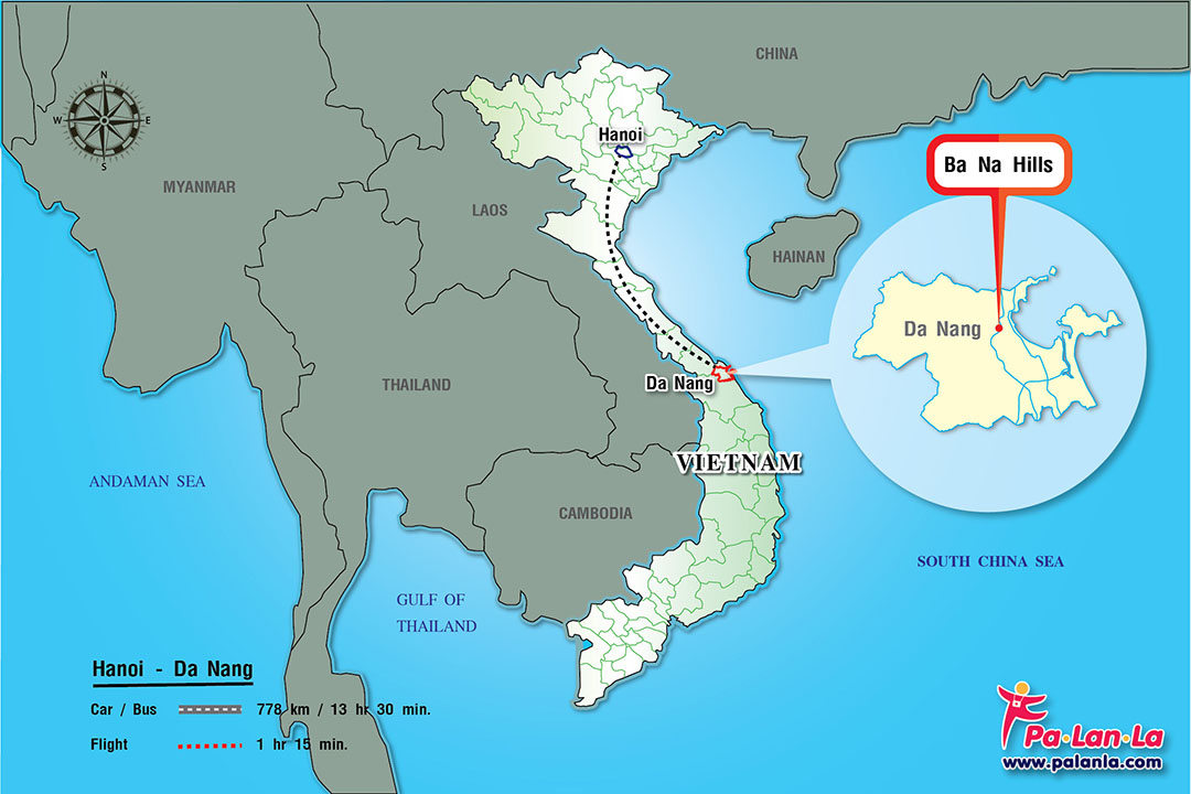 บาน่าฮิลส์ตั้งอยู่ในจังหวัดดานัง จากกรุงเทพฯ ไปดานัง นักท่องเที่ยวสามารถใช้บริการเที่ยวบินระหว่างประเทศบินไปลงที่ดานังได้โดยตรง มีสายการบินที่ให้บริการทั้งจากท่าอากาศยานนานาชาติดอนเมือง และท่าอากาศยานนานาชาติสุวรรณภูมิ เที่ยวบินตรงใช้เวลาประมาณ 1.25 ชั่วโมง