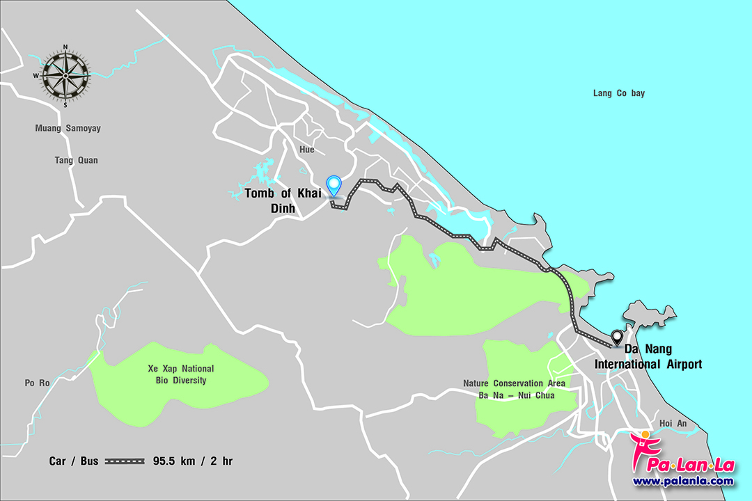 จากท่าอากาศยานนานาชาติดานังไปยัง Tomb of Khai Dinh มีระยะทาง 95.5 กิโลเมตร ใช้เวลาในการเดินทางโดยรถยนต์ประมาณ 2 ชั่วโมง โดยใช้ถนนสาย Duong Nguyen Tat Thanh ไปทาง Nguyen Luong Bang/QL1A มุ่งไป Hoa Hiep Nam ตาม QL1A ไปทาง Khai Dinh มุ่งไป Thuy Bang, Thi xa Huong Thuy เลี้ยวซ้าย เข้าสู่ Khai Dinh (ป้ายบอกทาง Lang Khai Dinh/Khai Dinh Tomb) ปลายทางจะอยู่ทางขวา