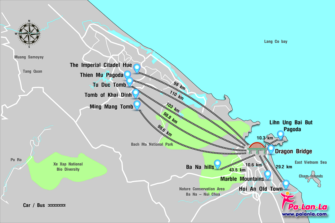 ข้อมูลการเดินทาง : พระราชวังเว้อยู่ห่างจากท่าอากาศยานนานาชาติดานัง 98 กิโลเมตร วิธีที่สะดวกที่สุดในการเดินทาง คือการนั่งรถยนต์ส่วนตัว รถแท็กซี่ หรือซื้อทัวร์