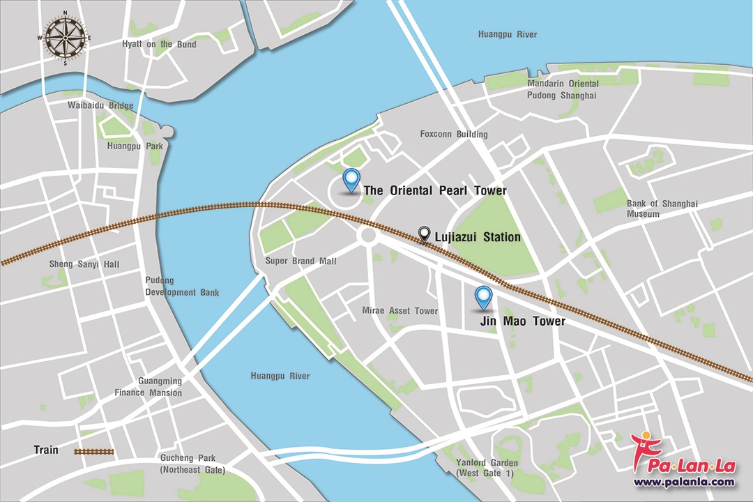 - รถไฟใต้ดิน ขึ้นรถไฟใต้ดินสาย 2 มาลงที่สถานี Lujiazui ออกที่ทางออกหมายเลข 1 ค่ารถไฟใต้ดินในเมืองเซี่ยงไฮ้เริ่มต้นที่ 3 หยวน และเพิ่มขึ้น 1 หยวนทุกๆ 10 กิโลเมตร