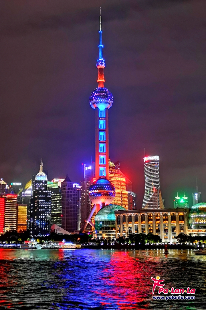 แสงสีของหอไข่มุกและอาคารอื่นๆ ส่องสะท้อนในแม่น้ำหวงผู่