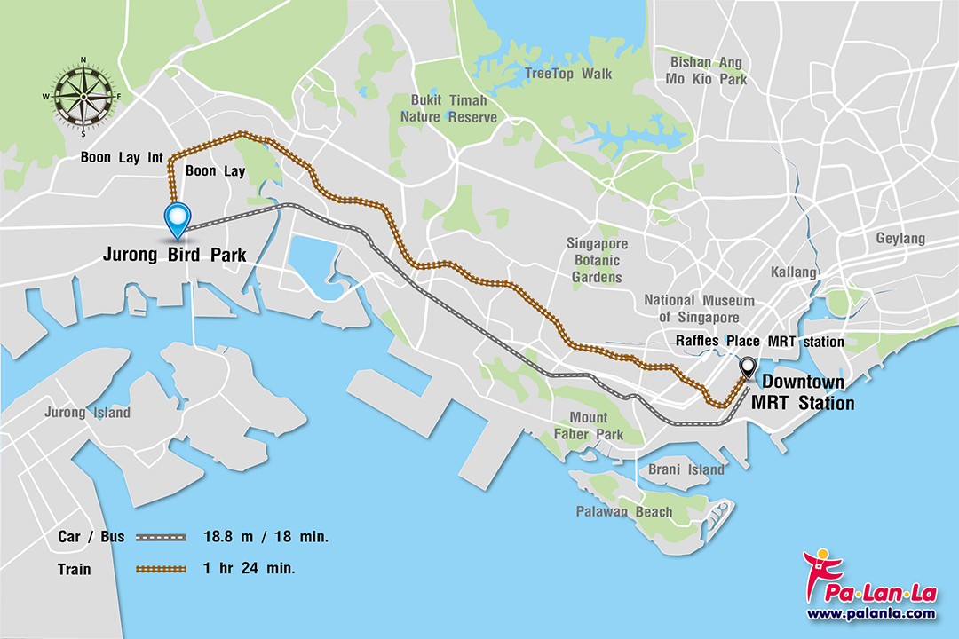 - รถไฟใต้ดิน จากสถานีรถไฟใต้ดิน Downtown MRT Station เดินไปขึ้นรถไฟใต้ดินสายสีเขียว (East West Line) ที่สถานี Raffles Place ระยะทางประมาณ 600 เมตร ไปลงที่สถานี Boon Lay เดินต่อไปยังป้ายจอดรถ Boon Lay Int ขึ้นรถประจำทางสาย 194 มาลงที่สวนนกจูร่ง ใช้เวลาเดินทางประมาณ 1 ชั่วโมง 24 นาที