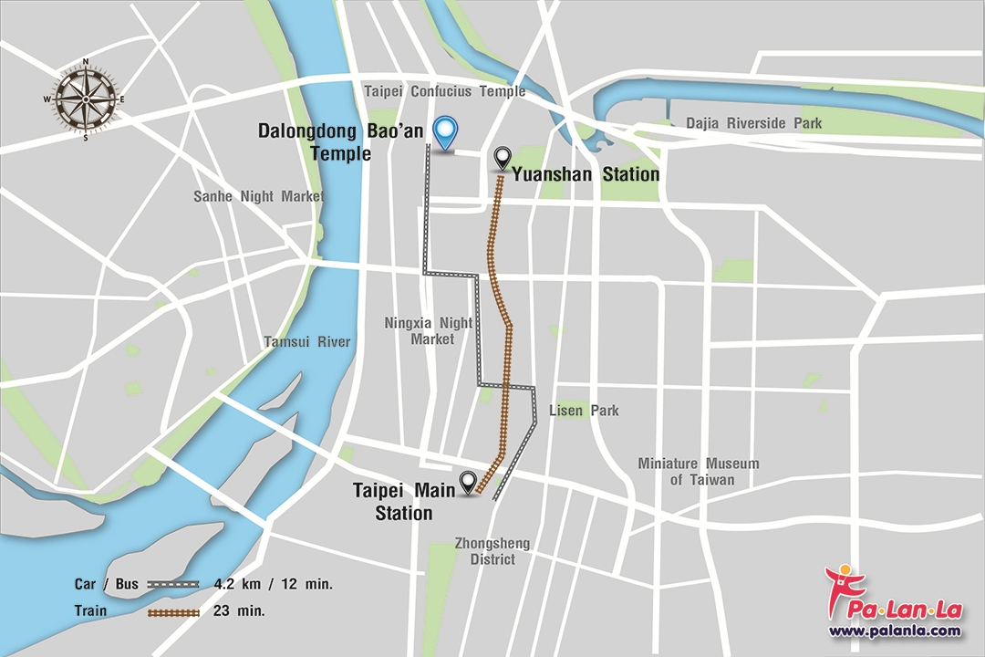 - รถประจำทาง นักท่องเที่ยวสามารถใช้บริการรถประจำทางสาย 205 และ 756 เพื่อเดินทางไปยัง Dalongdong Bao’an Temple แต่การเดินทางด้วยวิธีนี้ใช้เวลาค่อนข้างนาน จากบริเวณ Taipei Main Station ใช้เวลาประมาณ 50 นาที