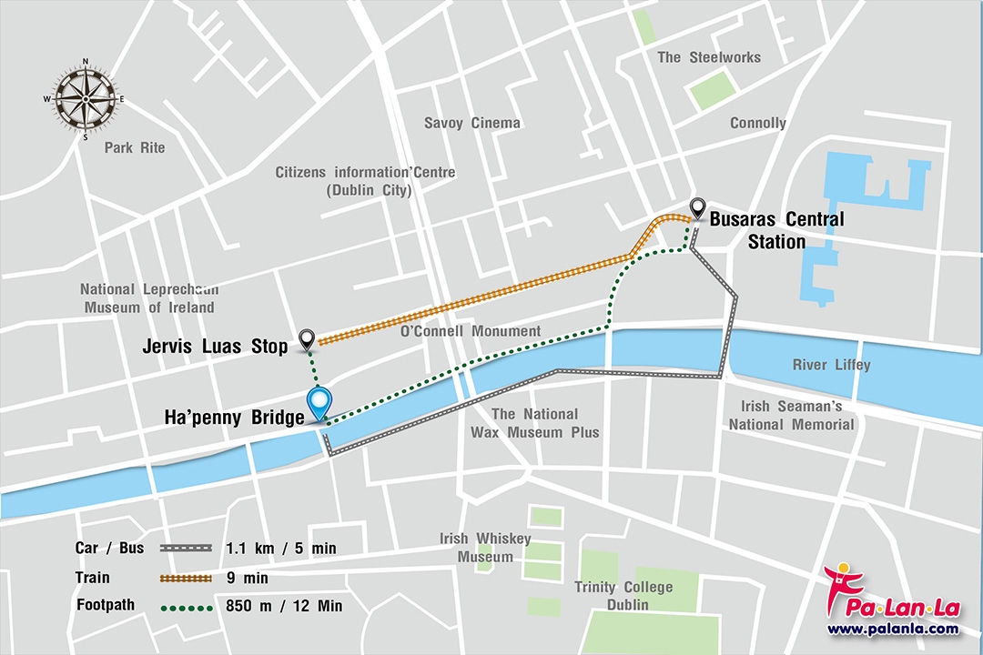 สะพานฮาพเพนนีเป็นสะพานข้ามแม่น้ำลิฟฟีย์ (River Liffey) ที่ไหลผ่านใจกลางเมือง การเดินทางจาก Busáras Central Station สามารถทำได้ดังนี้
