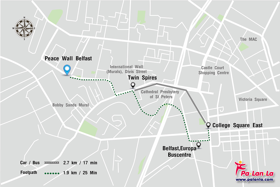 กำแพงสันติภาพ (Peace Wall) ตั้งอยู่ไม่ไกลจากใจกลางเมือง ถ้าเดินทางจาก Belfast, Europa Buscentre สามารถเลือกวิธีการเดินทางมาได้ ดังนี้