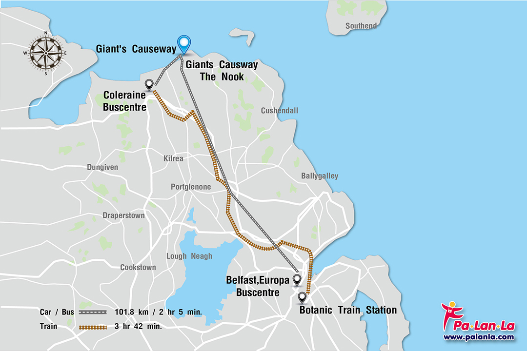 - รถโดยสารประจำทาง จาก Belfast,Europa Buscentre เมืองเบลฟาสต์ นักท่องเที่ยวสามารถนั่งรถประจำทางมาโดยใช้เวลาประมาณ 2.5 ชั่วโมง โดยนั่งรถประจำทางสาย 221 ใช้เวลาประมาณ 1 ชั่วโมง 35 นาที มาลงที่ Giants Causway The Nook แล้วเดินต่อประมาณ 30 นาที 2.2 กิโลเมตร