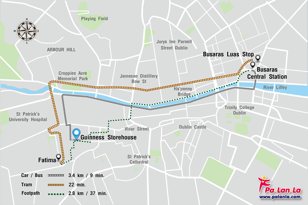 - รถราง นั่งรถรางจากสถานี Busaras Luas Stop ไปยังสถานี Fatima ใช้เวลาประมาณ 14 นาที และเดินต่ออีกประมาณ 650 เมตร ประมาณ 8 นาที รวมเวลาทั้งหมดประมาณ 22 นาที จะถึงโรงเบียร์กินเนสส์