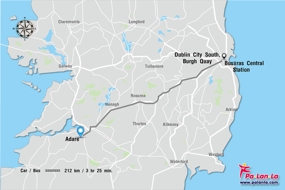 หมู่บ้านอะแดร์ ตั้งอยู่ห่างจากตัวเมืองลิเมอร์ลิค ประมาณ 14 กิโลเมตร จาก Busáras Central Station กรุงดับลิน สามารถใช้วิธีการดังนี้