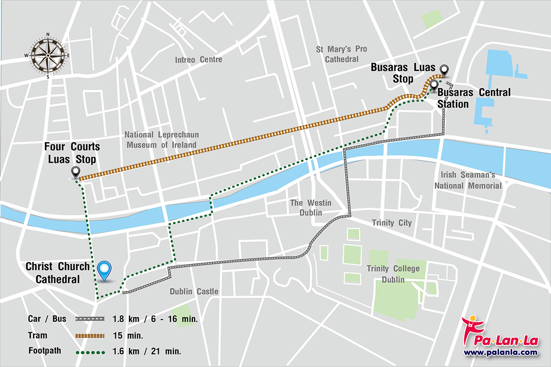 - รถโดยสารประจำทาง จาก Busaras Central Station ขึ้นรถประจำทางสาย 27 และเดินอีกประมาณ 210 เมตร ใช้เวลาประมาณ 2 นาที จะถึงอาสนวิหารไครสต์ เชิร์ช ดูตารางเวลาและรายละเอียดได้ที่ ศูนย์รถประจำทางดับลิน https://www.dublinbus.ie/