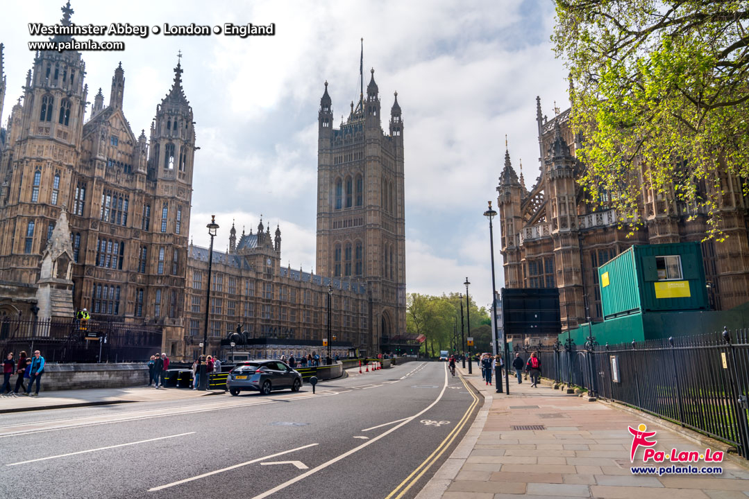 ขวามือของภาพคือส่วนของเวสต์มินสเตอร์แอบบีย์ ซ้ายมือของภาพคือพระราชวังเวสต์มินสเตอร์