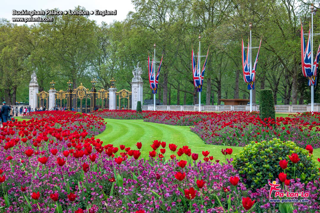 ดอกทิวลิปเบ่งบานสวยงามรอบๆ บริเวณสวนดอกไม้หน้าพระราชวังบักกิงแฮม