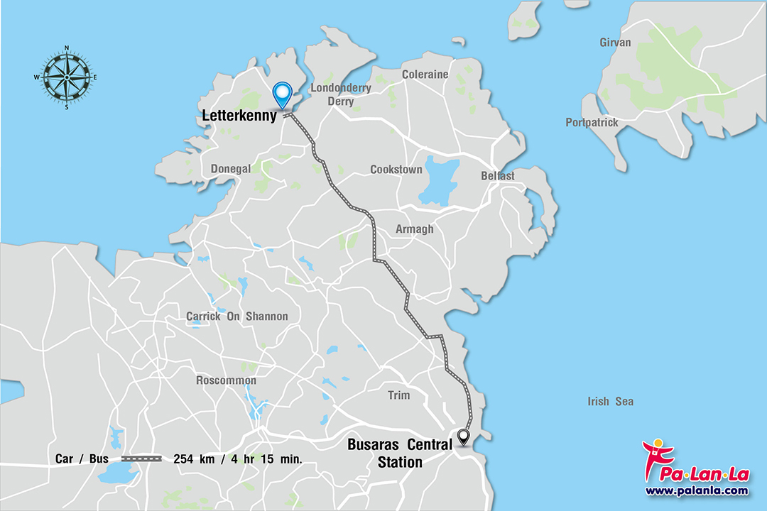 - รถโดยสารประจำทาง นักท่องเที่ยวสามารถใช้บริการรถประจำทางที่สถานี Busáras Central Station มาลงที่สถานี Letterkenny ระยะทาง 254 กิโลเมตร ใช้เวลาประมาณ 4 ชั่วโมง