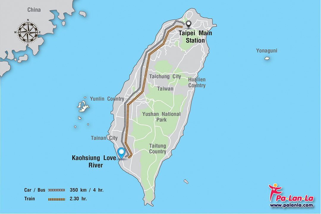 - รถไฟ จากสถานี Taipei Main Station นั่งรถไฟความเร็วสูง (THSR) ไปลงสถานี Zuoying ที่เมืองเกาสง (Kaohsiung) จากนั้นต่อ Shuttle Bus หรือรถไฟฟ้ามาที่ Kaohsiung Love River ได้เลย