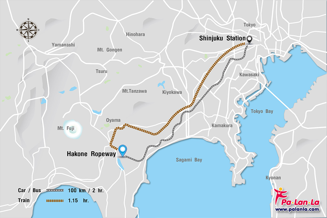 - รถยนต์ ฮาโกเน่โรปเวย์อยู่ห่างจากโตเกียวประมาณ 100 กิโลเมตร การเดินทางโดยรถยนต์ใช้เวลา 2 ชั่วโมง