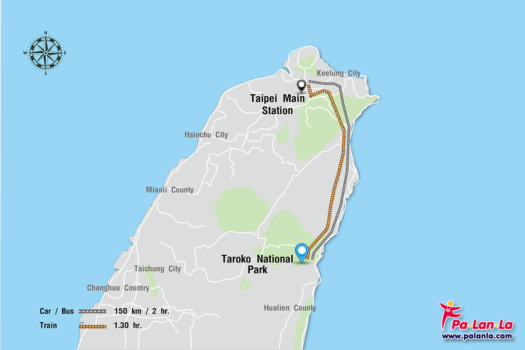 - รถยนต์ การเดินทางโดยรถยนต์มาจากไทเปไปยัง Taroko National Park มีระยะทางประมาณ 150 กิโลเมตร ใช้เวลาเดินทาง 2 ชั่วโมง
